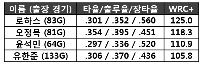 황재균의 영입으로 kt는 일단 불안했던 내야를 안정시키는 큰 효과를 얻었다. 이제 다음은 외야의 정비가 필요하다. 올 시즌 좋은 모습을 보인 중견수 로하스를 중심으로, 로하스의 양 파트너를 새로 확정 지어야 한다. 올 시즌 kt외야의 날개들은 모두 좋은 모습을 보여주었다. 좌익수 오정복은 불안한 수비를 높은 타율(.355)로 만회해줬고, 우익수 유한준도 중심타선에서 팀을 지탱했다(.306 / 13홈런). 하지만 오정복은 작년에 비해 7푼 가량 상승한 BABIP의 덕을 본 결과였고(.322->.394), 유한준은 노쇠화가 우려되는 서른 후반의 나이라는 명확한 한계를 가지고 있다. kt는 내후년 김민혁, 배병옥 같은 주요 외야 유망주들이 제대를 앞두고 있다. 이때까지만 이들이 버텨줄 수 있다면, 외야의 자연스러운 세대교체도 기대된다. 더하여 특급 신인 강백호의 외야 합류가능성도 충분하다.