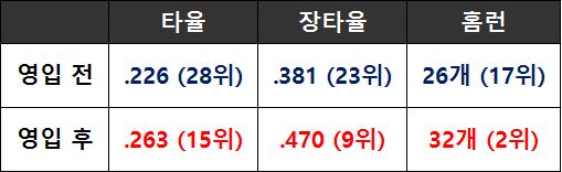 JD 마르티네즈 영입(7월 19일 기준) 전 후 좌완 상대 성적 비교