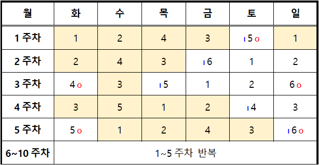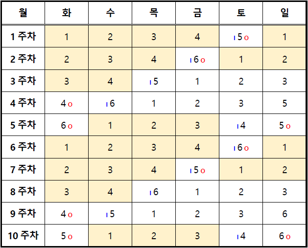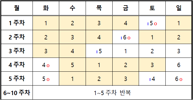 시즌이 화요일부터 시작된다고 가정하고 구상해본 KBO 리그식 6선발 체제의 등판 일정은 위와 같다. 각 칸의 중앙에 적힌 숫자는 선발투수의 순번을 의미한다(1선발=1, 2선발=2). 그 양 옆에 파란색과 빨간색으로 적혀 있는 I 와 O는 IN 과 OUT의 약자로, 각각 1군 엔트리 등록과 말소를 의미한다. 이러한 일정대로 6선발을 구성해 10주(60경기)를 진행할 경우, 팀의 선발투수들은 다음과 같은 등판 횟수를 기록하게 된다.