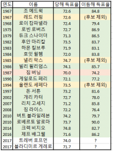 재미있는 사실 하나. 한 해에 다섯 명 이상이 BBWAA의 투표를 통해 명예의 전당에 들어갔던 것은 역사상 단 한 번, 바로 위에서 언급했던 1936년 원년뿐이다. ‘First Five(최초의 5인)’라 불리기도 하는 이들은 야구인들 사이에서도 특별한 의미를 지니는 인물들이다. 과연 올해에는 다섯 명이 동시 입성에 성공할 수 있을까?