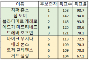 올해 처음으로 후보에 오른 선수들 중에는 1990년대 애틀랜타 브레이브스의 전성기를 이끌었던 3루수 치퍼 존스와 통산 600홈런을 달성한 짐 토미가 가장 눈길을 끈다. 실제로 존스와 토미는 현재까지 공개된 155개의 표 가운데 153표와 147표에 이름을 올리면서 나란히 선두권을 달리고 있다. 이변이 없는 한 명예의 전당에 들어간다고 봐도 좋은 페이스다.
