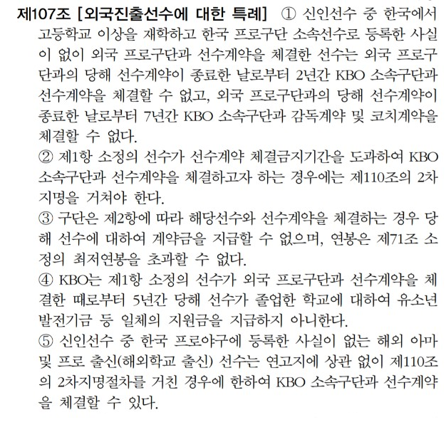 < KBO 규약 제 107조 (출처: KBO 공식 홈페이지) >