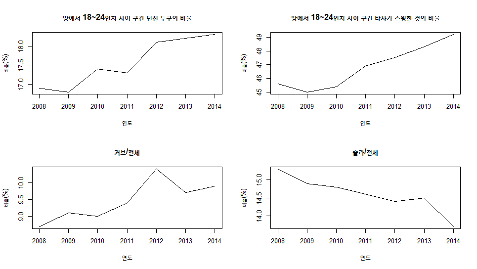 <2008~2014시즌 메이저리그 투구 데이터. 스트라이크 존 하단 1/3에 해당하는 영역에 투수들이 더 많은 공을 던졌다(위쪽 그래프 2개). 낮은 공이 더 많이 스트라이크가 되자 커브 구사 빈도가 늘어났고 슬라이더 구사 빈도는 줄어들었다(아래 그래프 2개). [2]>