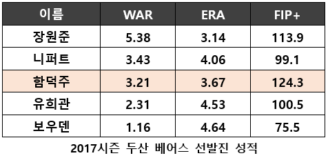 빼어난 탈삼진 능력(K/9 9.11)을 앞세워 수준급의 기록을 남겼던 함덕주의 2017년은 이들 중에서도 특히 인상적이었다. 함덕주는 기대주 시절의 김광현과 양현종보다도 훌륭한 성적을 올렸고, 그들이 본격적인 ‘질주’를 시작한 이후 보여준 폭발적인 모습에 버금갈 정도의 위력을 과시했다. 팬들은 자연스레 함덕주에게서 차기 두산의 선발진을 이끌 ‘에이스의 향기’를 느꼈다.