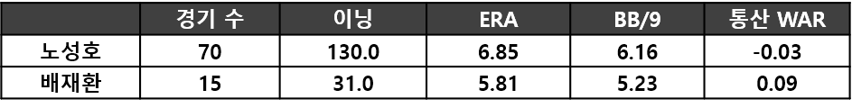 <노성호와 배재환의 데뷔 후 통산 성적>