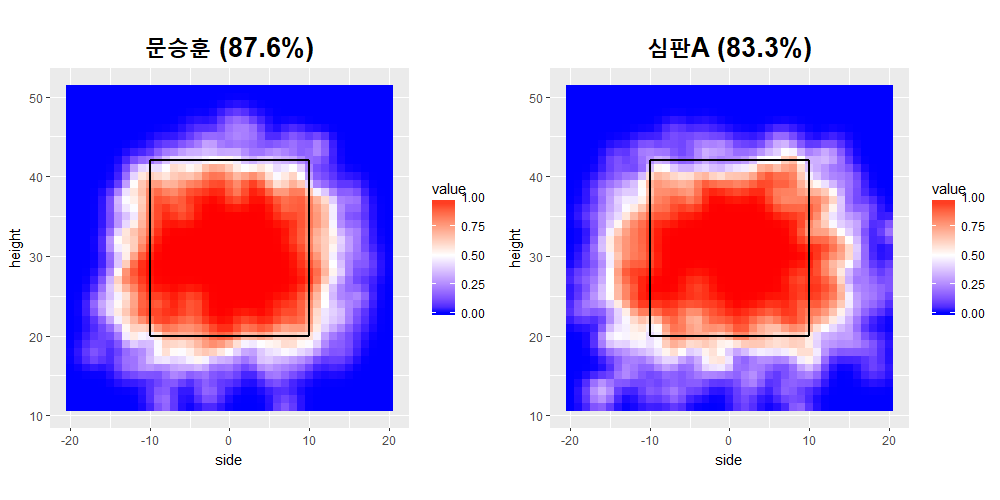 정확도가 가장 높았던 문승훈 심판과 가장 낮았던 심판의 스트라이크 판정 결과를 살펴보면 확연한 차이를 찾을 수 있다. 먼저 문승훈 심판의 판정 결과를 살펴보면 스트라이크 존의 좌우 폭이 좁고, 그 모양이 사각형에 가까우며, 가장자리의 경계가 매끈한 편이다. 반면 정확도가 가장 낮았던 심판 A의 판정 결과는 좌우 폭이 넓고 존의 가장자리가 마치 아메바와 같이 중구난방으로 뻗어있다.