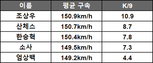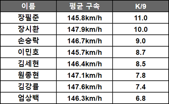<표2> 2018년 패스트볼 평균 구속 149km/h 이상 투수 9이닝 당 탈삼진(K/9)