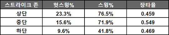 하이 패스트볼은 헛스윙 역시 더 많이 유도한다. 존 하단에 들어간 패스트볼은 9.6%의 헛스윙밖에 이끌어내지 못했지만 상단의 패스트볼은 2배가 넘는 23.3%의 헛스윙률을 기록했다.