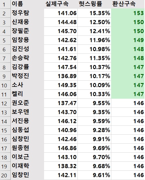 아래 표는 KBO리그의 투수들이 기록한 헛스윙률을 바탕으로 구속을 나타낸 것이다. 대상은 2017년 시즌에 한해 200개 이상의 패스트볼을 던진 투수를 기준으로 했다. 환산방식은 다음과 같다. 어느 투수의 패스트볼이 8%의 헛스윙률을 기록했다면, 이 투수의 구위는 상위 20%에 해당한다. 작년 타자들이 상대한 패스트볼 가운데 상위 20%에 해당하는 구속은 144km/h다. 이 두 사실을 결합하면, 이 투수의 공은(실제 구속과는 별개로) 144km/h와 같이 느껴졌으리라 추정할 수 있다. 확률은 감마분포에 적합시켰다.