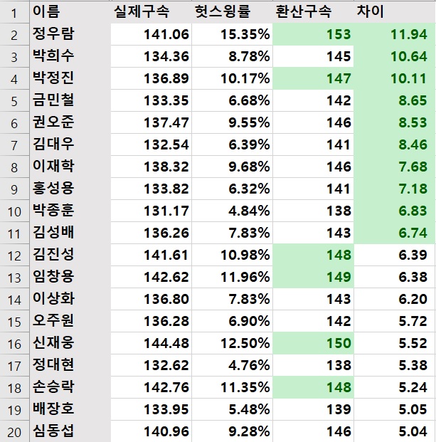 상단에 있는 선수들은 우리가 익히 “위력적인 패스트볼”을 던진다고 알고 있던 명단과 일치한다. 그렇다면 스피드건에 찍히는 실제 구속과 구위가 가장 차이 나는 선수는 누구일까? 아래는 실제 구속과 환산구속의 차이 순서대로 표를 재정렬한 것이다.