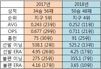 2017년 전반기 vs 2018년 전반기 (괄호는 메이저리그 전체 순위)