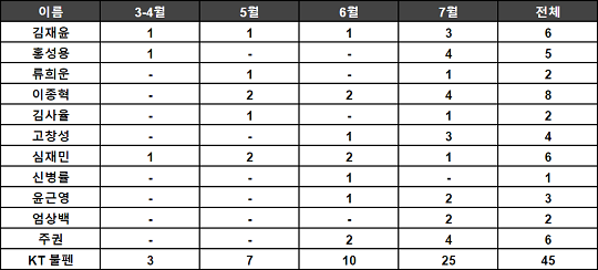 <표1>에서 볼 수 있듯 김진욱 감독은 철저한 관리가 강점이다. 하지만 필승조가 모두 이탈한 7월에 사정이 달라졌다. KT의 전체 연투 중 55.6%가 7월에 몰려있고, 총 4회뿐인 3연투 역시 모두 7월에 나왔다(이종혁 2회, 주권 1회, 홍성용 1회).