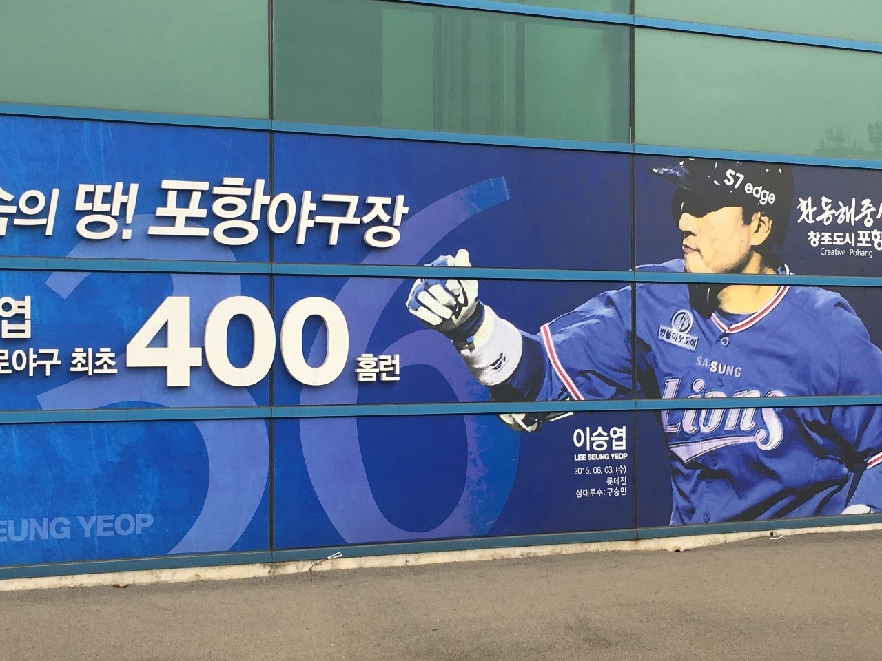 포항야구장에 걸린 이승엽의 KBO 통산 400호 홈런 기념 표식. 너 왜 시비냐. (사진=양정웅)