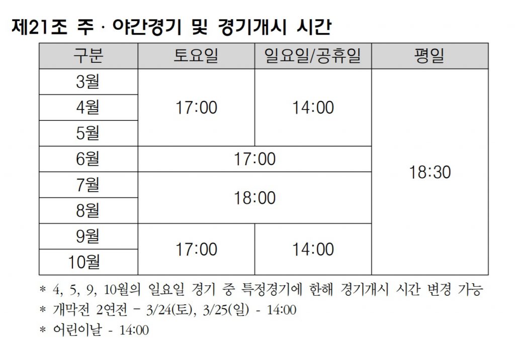 그리고 KBO는 월별로 야간경기 및 경기개시 시간을 달리 정해서 운영한다. 야간 경기와 그 외 경기는 소음과 빛에 대한 체감이 다를 것이다. 일반적으로 주민들이 출근이나 외부 활동으로 낮에 거주지에 머무는 경우가 적기 때문이다. 2018시즌 일정표에 따르면, 광주-KIA타이거즈 챔피언스필드는 올해 14:00에 시작하는 경기가 11번, 17:00에 시작하는 경기가 9번, 18:00시에 시작하는 경기가 7번, 18:30에 시작하는 경기가 45번으로 예정됐다. 17:00이후 시작하는 경기를 야간경기로 가정한다면, 광주-KIA타이거즈 챔피언스필드의 경우 61번의 야간경기가 열릴 예정이었다. 2018년의 경우, 광주-KIA타이거즈 챔피언스필드는 1년의 16.7%에 해당하는 야간경기를 할 예정이었다.