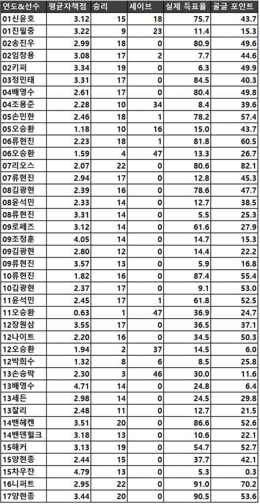물론 위 모델의 예측값이 역대 결과와 정확하게 일치하지는 않는다. 2002년 송진우는 81%의 압도적인 득표율을 기록하며 골든글러브를 수상했지만, 모델은 고작 49.6 포인트만을 예측하며 임창용과 키퍼와 비슷한 수준으로 둔다. 이 차이는 2002시즌에 아시안게임 출전과 KBO리그 통산 최다승 경신이라는 금자탑을 모델이 고려하지 않기 때문이다. 꾸준했지만 화려함은 덜했던 탓에 그동안 골든글러브와 인연이 없었던 그의 경력을 보상하는 측면 또한 실제 투표에는 반영되었을 것이다.