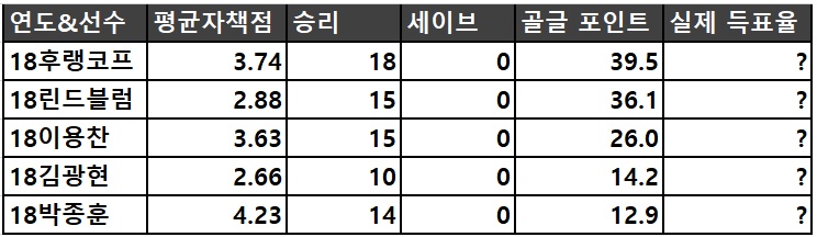 올해 KBO리그 골든글러브 경쟁에 특히 주목할 만한 이유가 바로 여기 있다. 앞서 살펴본 모델은 후랭코프를 린드블럼보다 근소한 우위에 두고 있다. 후랭코프는 10월 3일 현재 18승으로 다승왕이 유력하다. 린드블럼은 승수 면에서는 15승으로 후랭코프보다 뒤처져있지만, 평균자책점을 비롯해 많은 면에서 후랭코프를 앞서고 있다. 즉 올해 투수 골든글러브는 기자단이 여전히 승리를 중요시할지, 아니면 세이버메트릭스의 영향으로 투구 내용을 보다 중요하게 여길지 알 수 있는 분기점이 될 가능성이 크다. 예측을 목적으로 하는 모델 또한 마찬가지로 변화의 갈림길에 서있다.