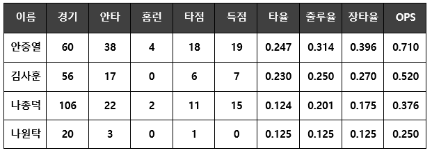 강민호의 갑작스러운 이적으로 공백 상태였던 포수진은 예상 그대로 ‘공백’으로 남았다. 개막전 주전 포수로 낙점된 나원탁은 수비에서 치명적 문제를 보였고, 이후 주전 마스크를 넘겨받은 나종덕은 타격에서 다른 의미로 ‘일을 냈다.’ 그렇다고 또 다른 포수 김사훈이 대단한 활약을 한 것도 아니었다. 결국 롯데 포수진은 부상으로 2년 가까이 공백기가 있었던 안중열이 돌아오고서야 정상화됐다. OPS 0.710의 안중열이 ‘보물’이라는 평가를 받을 정도로 올해 롯데 포수진은 팀의 아킬레스건이었다.