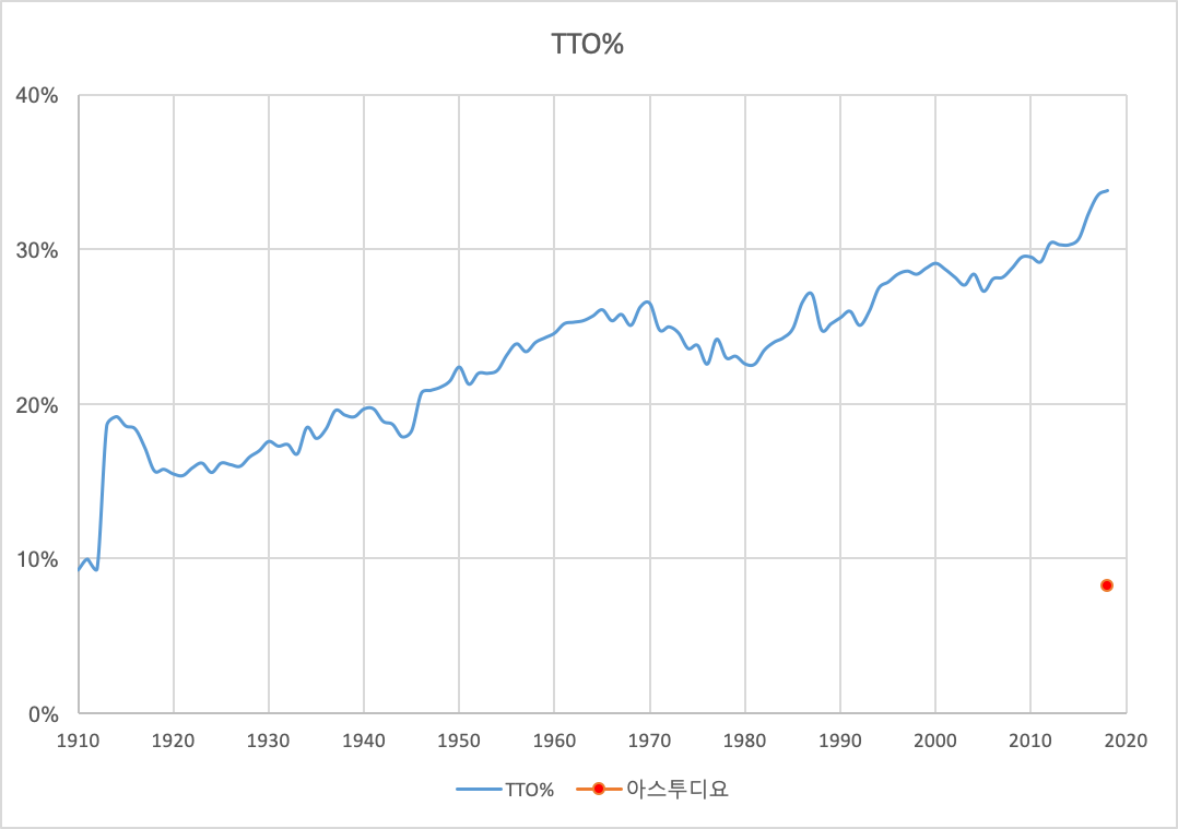메이저리그 평균 TTO%는 1910년부터 꾸준히 상승하고 있다. 시간이 지날수록 타자들은 더욱더 많은 홈런을 쳤으며 그만큼 삼진과 볼넷도 많이 당했다. 1910년에 고작 9.3%였던 TTO%는 100여 년이 지난 현재 33.8%로 상승 곡선을 유지하고 있다.