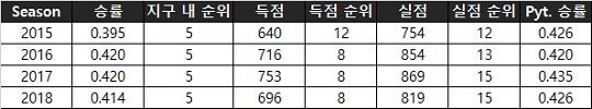 [표] 2015~2018 신시내티 레즈의 내셔널 리그 내 성적(출처=Baseball-Reference)