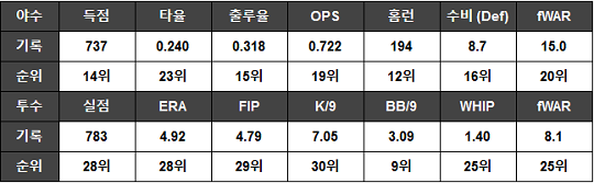시즌 성적 : 665타석148안타 21홈런 92볼넷 156삼진 0.264/0.377/0.434 118 wRC+