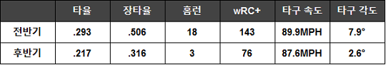 후반기에 언제나 강한 모습을 보여주던 선수라 후반기에 더욱 큰 기대를 걸고 있었지만 스윙이 조금씩 무너지며 아쉽게 시즌을 마감했다. 특히 전반기에는 뜬 공으로 재미를 많이 봤지만 타구의 땅볼 비율이 57.8%로 전반기(45.9%)에 비해 큰 폭으로 상승하며 타석에서의 생산성이 많이 떨어졌다. 그 결과 그는 후반기 겨우 3개의 홈런에 그치는 등 장타를 좀처럼 만들어 내지 못했고 내년 시즌이 순탄치 않을 것 같은 걱정마저 드는 모습으로 시즌을 마쳤다.