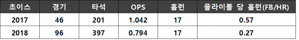 8월 15일부터 경기를 뛴 샌즈는 넥센에 있어 신의 한 수가 되었다. 아시안게임 휴식기 동안 한국 생활 적응을 마친 그는 정규시즌에 12홈런 1.122 OPS, 포스트시즌에 3홈런 1.106 OPS를 기록하며 넥센의 가을야구에 앞장섰다. 혹시 넥센 팬들은 샌즈가 뛸 수 있도록 웨이버 공시를 당한 외국인 타자 마이클 초이스에게 감사라도 해야 것일까? 작년보다 기회를 약 두 배나 더 받았지만, 초이스의 홈런 개수에는 변함이 없었다. 작년에 지나치게 높다고 지적받은 홈런 당 플라이볼 수치는 결국 운이었다. 전반적인 타격 성적이 실망스러웠음은 두말할 것도 없다.