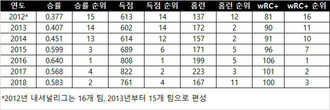 [표1] 시카고 컵스의 지난 7년간 각종 공격 지표 차트 <순위는 내셔널리그 기준>