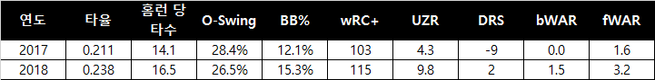[표2] 카일 슈와버의 2017-2018시즌 비교 (출처=Fangraphs, Baseball-Reference)