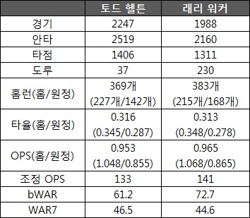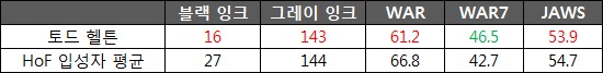 [표 1] 토드 헬튼의 명예의 전당 입성자(1루수 기준)의 주요 수치 비교