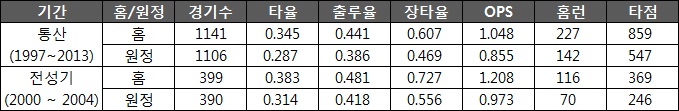 [표 2] 토드 헬튼의 통산(1997~2013) & 전성기 5년(2000~2004) 홈,원정 스플릿