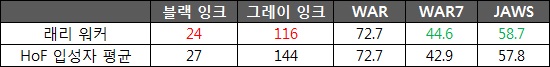 *WAR – 대체 선수 대비 승리 기여도, WAR7 – 선수의 가장 좋은 일곱 시즌 WAR의 합산, JAWS – 선수의 꾸준함과 임팩트를 고려한 명예의 전당을 가늠하는 지표 중 하나