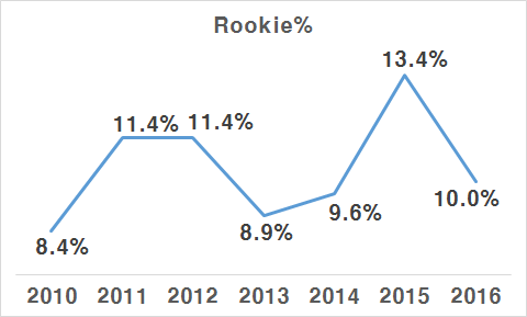 최근 메이저리그에서 신인 선수들이 팀 전력에서 차지하는 비중은 매우 크다. 2000년대 초반엔 3~4% 가량이었다. 하지만 2010년대 들어 크게 상승하기 시작했다. 특히 지난 2년 간은 10%를 상회했다. 즉시 전력감 유망주 다수 보유는 시즌 운용에서 매우 의미가 커졌다.
