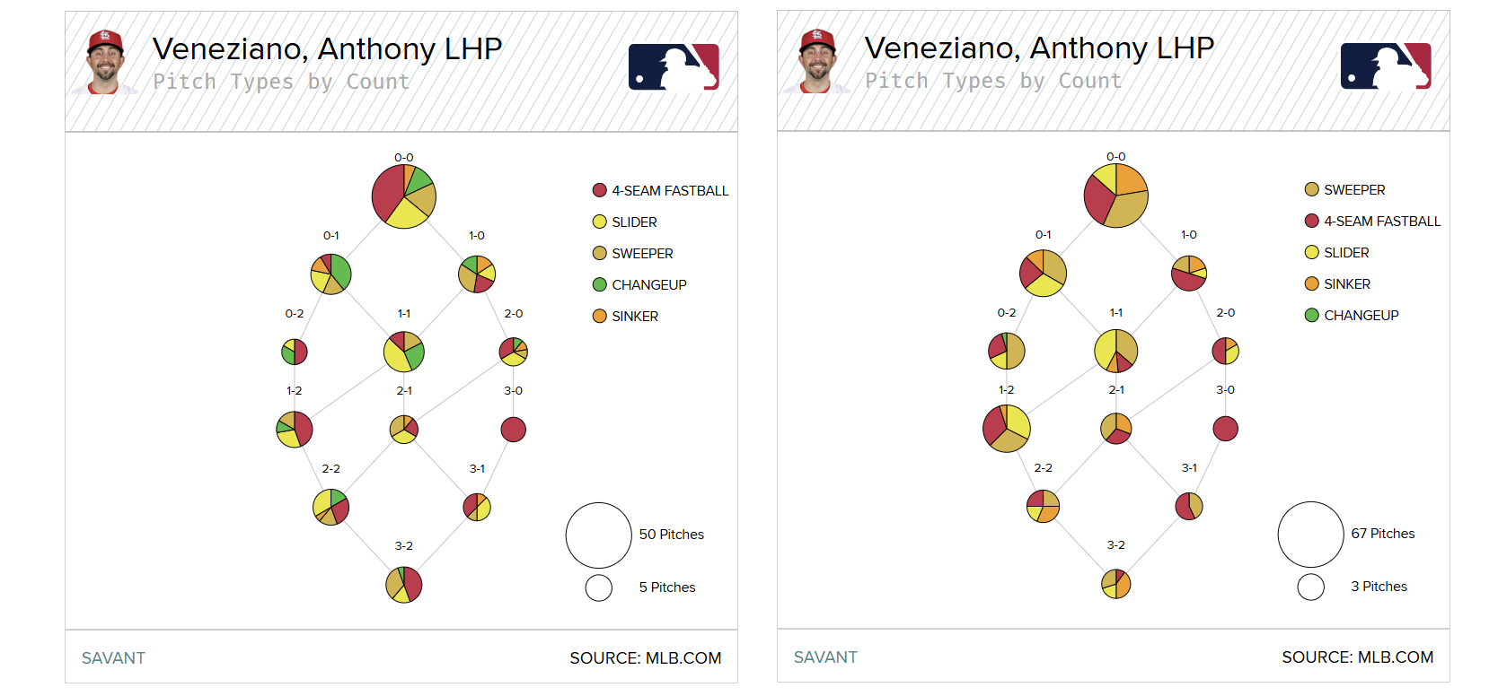 베네지아노는 지난해 메이저리그에서 50.6%의 땅볼 비율을 기록했다. 리그 평균 대비 월등히 높은 수치였다. 베네지아노가 땅볼을 효율적으로 유도할 수 있었던 데에는 2025시즌부터 구사한 싱커가 가장 큰 역할을 했다.