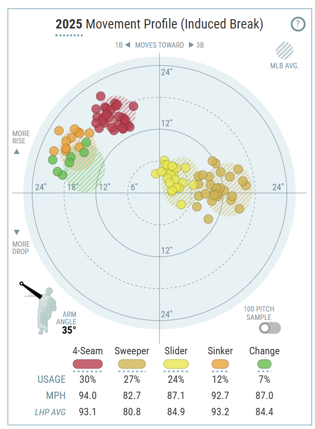 구사하는 구종 중 절반 이상이 스위퍼, 슬라이더와 같이 좌타자 바깥쪽으로 휘는 구종인 것이 눈에 띈다. 슬라이더는 메이저리그 평균보다 약간 작은 횡적 움직임을 보인 채 빠른 구속을 가졌다. KBO리그에서는 ‘고속 슬라이더’로 경쟁력을 갖추리라 짐작된다.