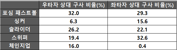 < 볼카운트별 구종 구사 비율 (왼쪽, 우타자 / 오른쪽, 좌타자) >