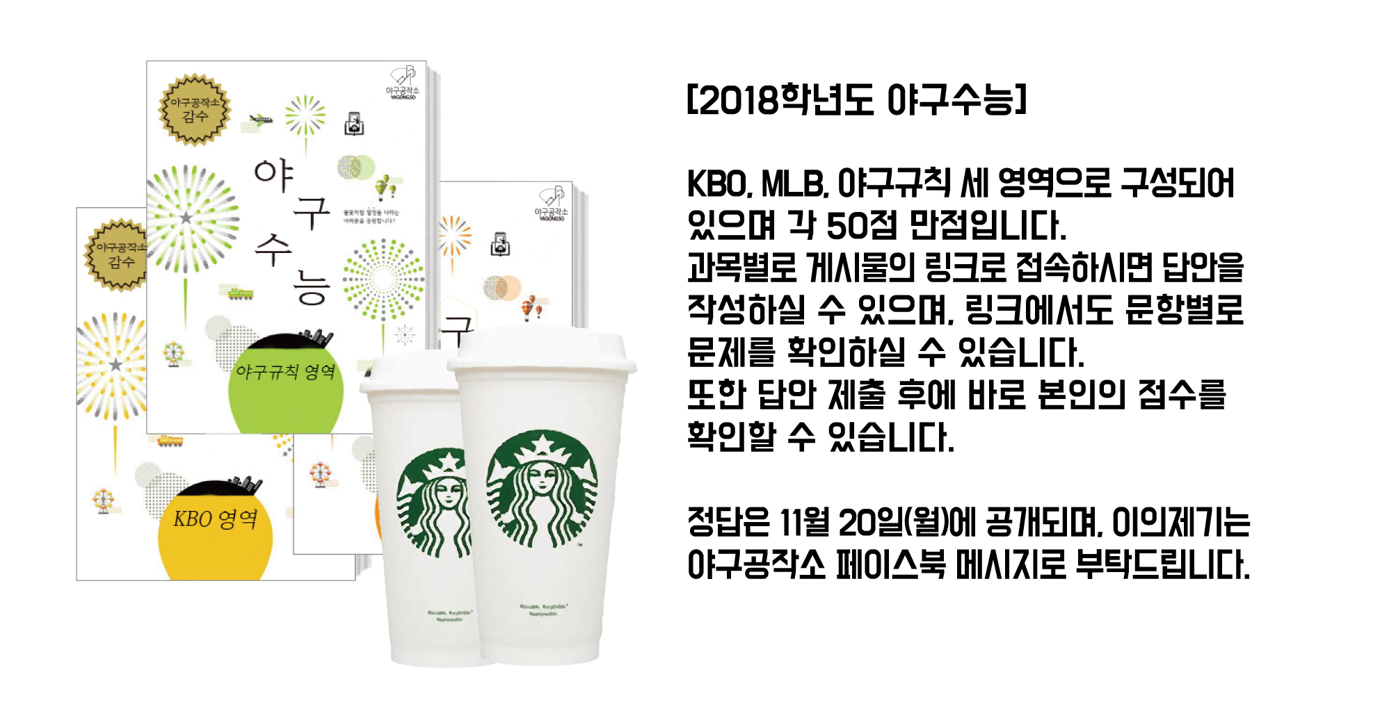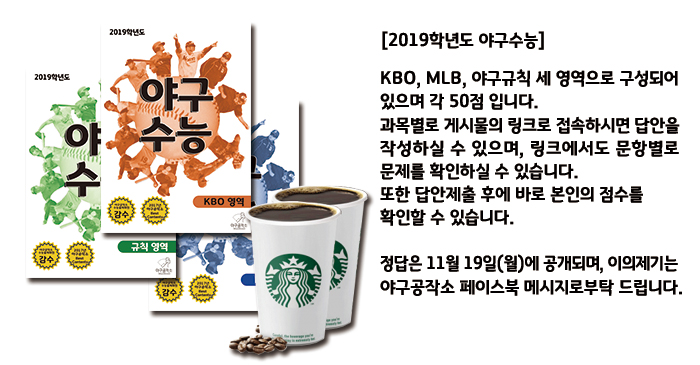 야구공작소 2018학년도 야구수학능력시험 답안작성 링크 KBO : https://goo.gl/pBhscU MLB : https://goo.gl/7cLP4M 야구규칙 : https://goo.gl/y6wFMU [야구수능 이벤트] 이벤트 1 (인싸용) 태그하고 커피먹자! 친구를 댓글에 태그하시면 추첨을 통해 스타벅스 기프티콘을 […]