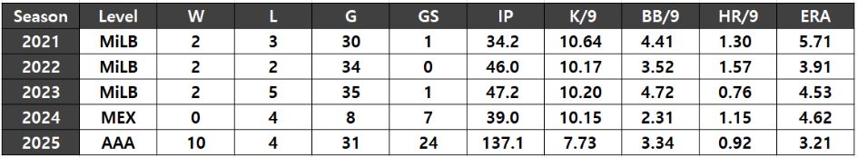제구도 개선됐다. 2023년까지 트리플A 통산 BB/9는 4.10으로 다소 높았지만 2025년 3.34로 트리플A 진출 이후 가장 낮은 수치를 기록했다. 그리고 S%도 2025년 63.0%로 2023년까지 트리플A 통산 60.7%보다 높았다.