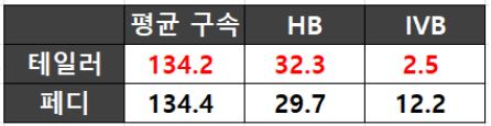 < 표4. 2025 AAA 커티스 테일러의 슬라이더 & 2024 MLB 에릭 페디의 스위퍼 (단위: km/h, cm) >