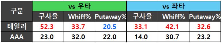 테일러는 좌·우타자를 가리지 않고 모두 슬라이더를 결정구로 가장 많이 사용했다. 결과는 좋았다. 슬라이더는 좌타자, 우타자 가리지 않고 리그 평균 이상의 헛스윙을 끌어냈다.