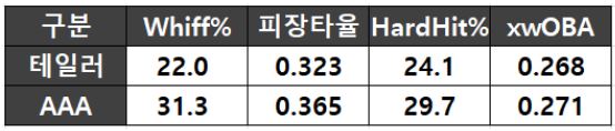 < 표6. 2025년 AAA 우투수 평균과 테일러의 체인지업 세부 지표 비교 (vs 좌타자) >