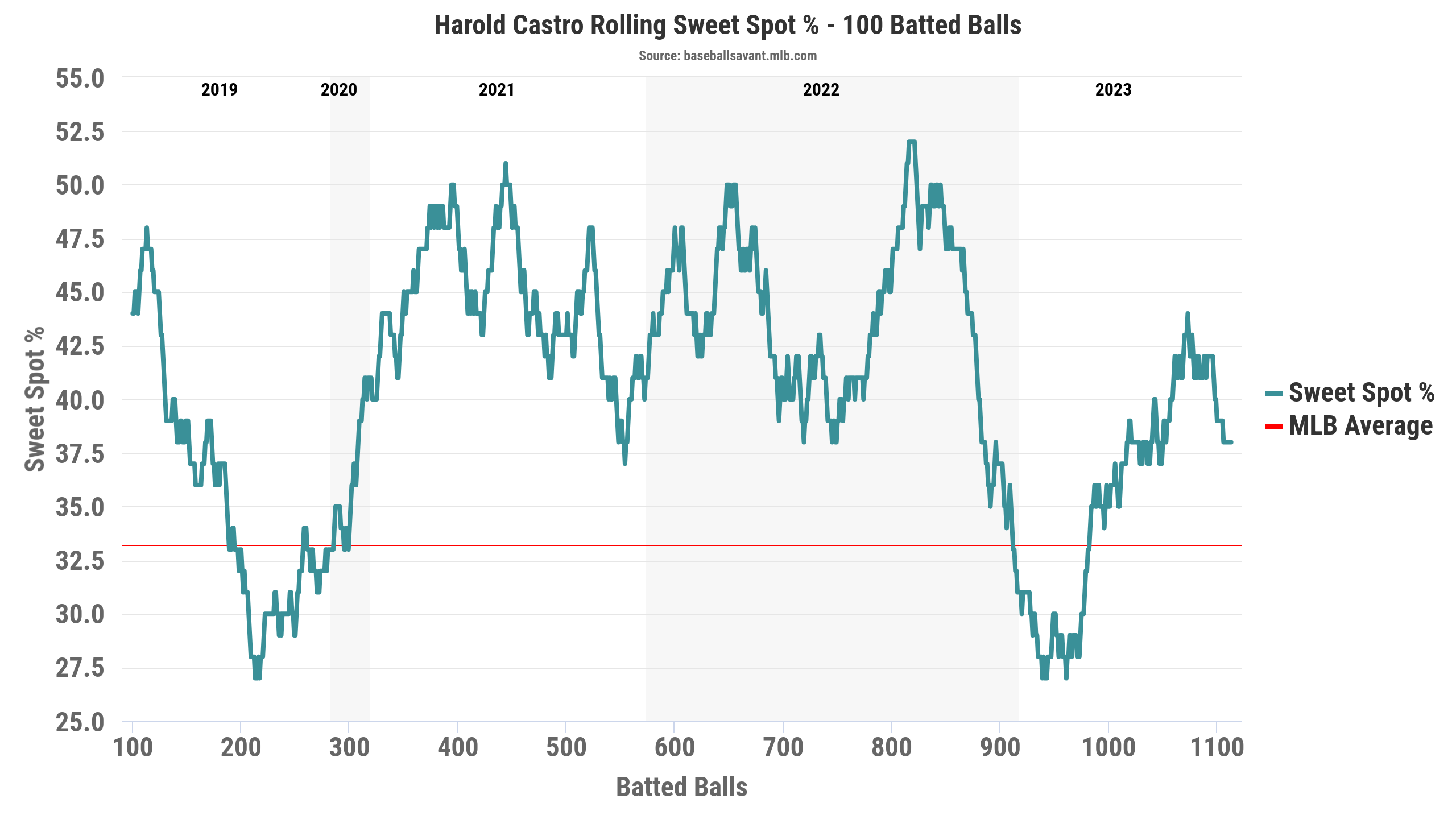 MLB 6시즌 동안 카스트로가 보여준 LA Sweet Spot%(이상적인 발사각 범위 – 8도 ~ 32도에 들어가는 타구의 비율) 40.6%였다. 이는 36.5%를 기록한 레이예스보다 높고 이 기간 MLB 평균인 33.3%보다 7.3%P 높았다.