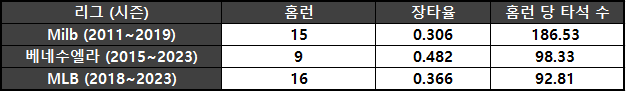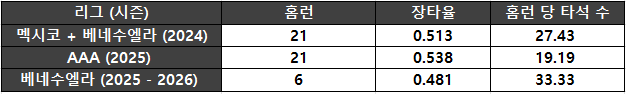 가장 크게 달라진 부분은 홈런 개수다. 2024년 멕시코 리그 티후아나와 베네수엘라 리그 레오네스 델 카라카스 소속으로 데뷔 첫 두 자릿수 홈런 시즌을 기록했다. 이 상승세를 타고 2025년 캔자스 시티 로열스와 마이너 계약을 맺은 그는 AAA 오마하 스톰 체이서스에서 21개 홈런 OPS 0.892를 기록하며 커리어하이 시즌을 달성했다.