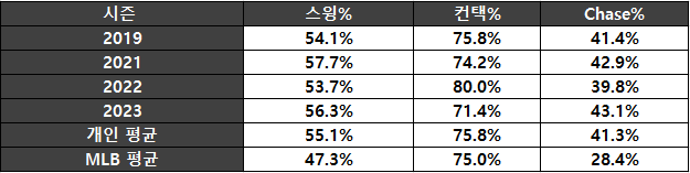 MLB에서 스윙률은 55.1%로 MLB 평균 47.3%보다 높았다. 컨택률은 MLB 평균 정도로 나쁘지 않은 컨택 능력의 타자라는 것을 확인할 수 있다.