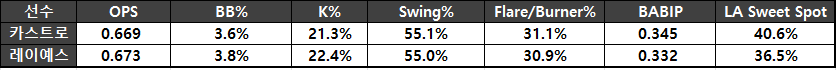 레이예스는 KBO리그에서 단일 시즌 최다 안타 신기록을 써 내렸다. MLB 시절 레이예스보다 BABIP과 Flare/Burner%, LA Sweet Spot%이 높았던 카스트로 역시 KBO 리그에서 좋은 결과를 기대할 수 있는 타자다.