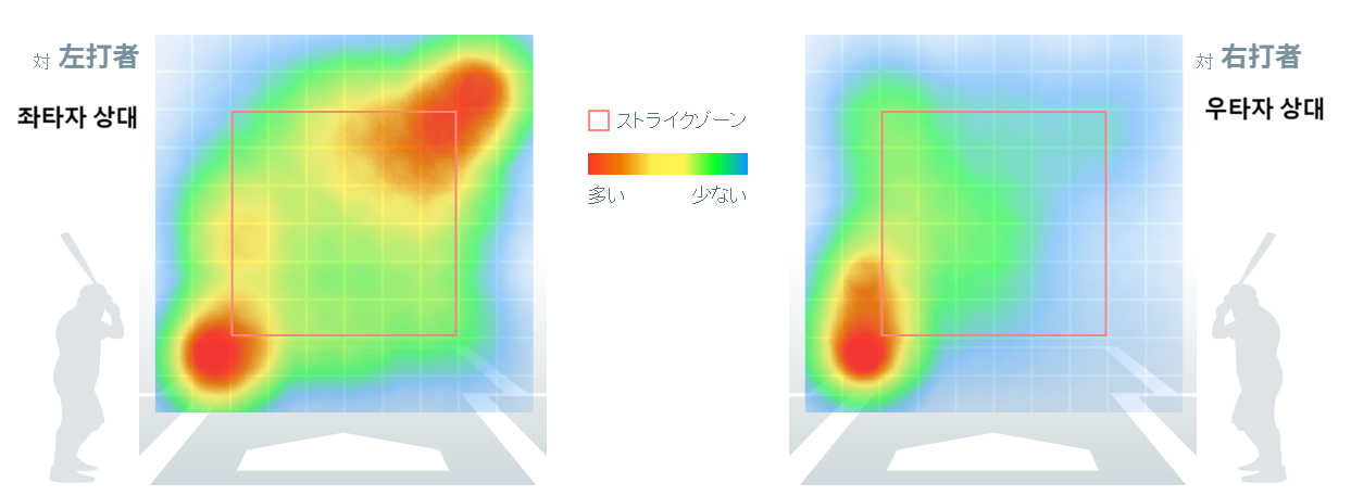 위 표를 보면 알 수 있듯 비슬리는 우타자를 상대할 때 슬라이더와 커터의 비중이 60%에 육박한다. 좌타자를 상대할 때는 또 다른 결정구인 스플리터를 10% 이상 구사했다. 바깥쪽 승부를 할 때 높은 코스에는 150km 내외의 포심을, 낮은 코스에는 140km 내외의 스플리터를 구사해 삼진을 노렸다. 전략이 잘 들어맞은 덕에 스플리터도 12.2%의 준수한 SwStr%를 기록했다.