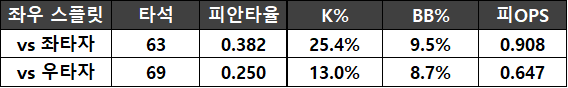 [ 표4 = 2025시즌 좌우 타자 상대 스플릿 ]