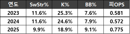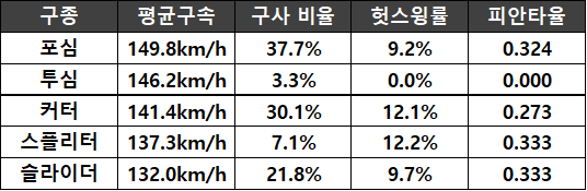 [ 표1 = 2025시즌 비슬리의 구종 구사 비율 및 구종별 성적 ]