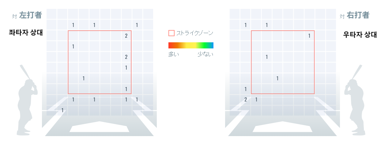 일본에서도 슬라이더의 무브먼트는 여전했다. 지난해는 2024시즌만큼 제구가 되지 않아 슬라이더의 SwStr%가 9.2%에 불과했다. 그러나 2024시즌만 하더라도 이 수치는 15.4%에 달했으며 2024시즌 삼진 75개 중 1/3이 넘는 26개의 삼진을 슬라이더로 쓸어 담았다.
