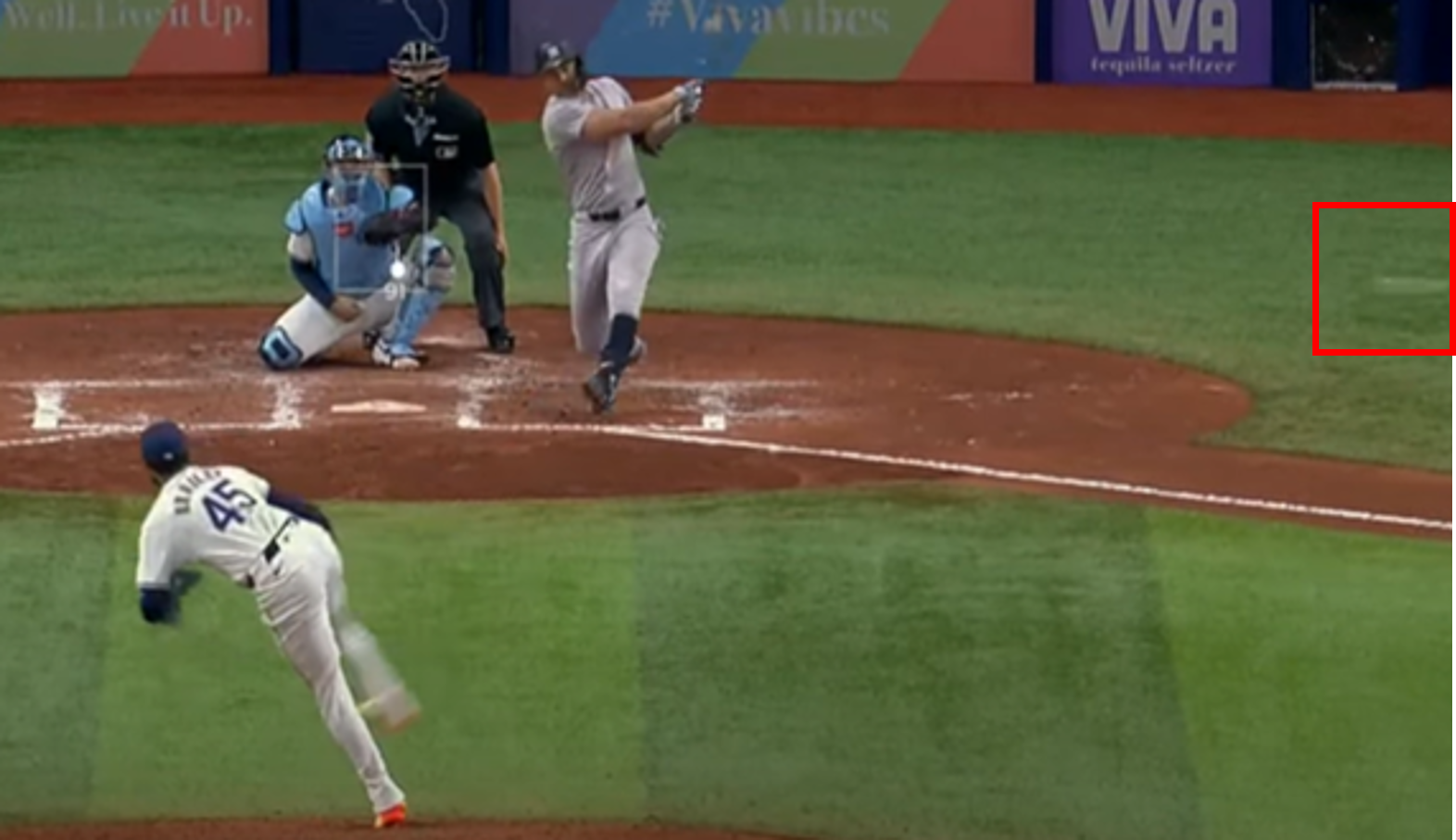 < 방송사 카메라로 찍은 지안카를로 스탠튼의 116.4마일 타구. 화면 우중단 흔들림처럼 보이는 흰색 부분(빨간 네모)이 공의 잔상이다. 이 공은 유격수 옆으로 벗어나 안타를 기록하였다. >