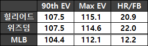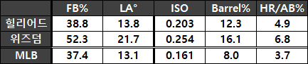 힐리어드는 시속 94마일(151.3킬로미터) 이하의 패스트볼을 상대로 그보다 빠른 패스트볼 상대보다 압도적으로 좋은 타구질을 뽑아냈다. 시속 94마일 이상의 패스트볼을 상대로 더 나았던 위즈덤과는 반대다. KBO리그 수준의 패스트볼을 상대로는 힐리어드가 위즈덤보다 꿀리지 않을 수도 있다.